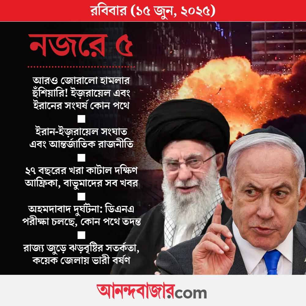 শুক্রবার ইরানের পরমাণুকেন্দ্র লক্ষ্য করে হামলা চালায় ইজ়রায়েলি সামরিক বাহিনী। ইজ়রায়েলি হানায় ইরানের সেনা সর্বাধিনায়ক-সহ অন্য শীর্ষ সামরিক কর্তারা নিহত হয়েছেন। প্রত্যাঘাত করেছে ইরানও। দু’দেশই আরও জোরালো আক্রমণ এবং প্রতিআক্রমণের হুঁশিয়ারি দিয়ে রেখেছে। ইরান জানিয়ে দিয়েছে, শুক্রবার রাতের ‘সীমিত জবাবে’র মধ্যে এই সংঘর্ষ থেমে থাকবে না। আবার ইজ়রায়েলও জানিয়ে দিয়েছে, ইরান ক্ষেপণাস্ত্র হামলা চালিয়ে যেতে থাকলে তেহরানবাসীকে এর ‘মাশুল গুনতে হবে’। ইরানের রাজধানী তেহরানকে জ্বালিয়েপুড়িয়ে খাক করে দেওয়ার হুঁশিয়ারি দিয়েছে ইজ়রায়েল। দু’পক্ষের কেউই পিছু হটতে নারাজ। এই অবস্থায় পশ্চিম এশিয়ার পরিস্থিতির দিকে নজর থাকবে আজ।