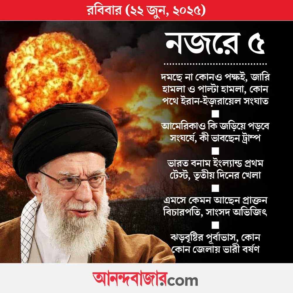 আলোচনার মাধ্যমে ইজ়রায়েল-ইরান সংঘর্ষে কোনও ইতি টানা সম্ভব কি না, তা দেখতে চাইছেন আমেরিকার প্রেসিডেন্ট ডোনাল্ড ট্রাম্প। ইরানে আক্রমণের বিষয়ে চূড়ান্ত সিদ্ধান্ত নেওয়ার আগে দু’সপ্তাহ সময় নিয়েছেন তিনি। যদিও ইরানের সন্দেহ, ইজ়রায়েল যা করেছে, সেটিকে আড়াল করার চেষ্টা করছে আমেরিকা। সেই কারণেই আলোচনার কথা বলছে। ইরানের বিদেশমন্ত্রী আব্বাস আরাঘচি বলেন, “আমরা জানি না এর পরেও আমেরিকাকে কী ভাবে বিশ্বাস করব।” আমেরিকা যদি আলোচনার মাধ্যমে সমাধান সূত্র বার করতে চায়, তবে সেই দৃঢ়তাও আমেরিকার আধিকারিকদের মধ্যে থাকা প্রয়োজন বলে মনে করছেন তিনি। এই অবস্থায় পশ্চিম এশিয়ার সংঘর্ষে আমেরিকার ভূমিকা কী থাকে, সে দিকে নজর থাকবে আজ।