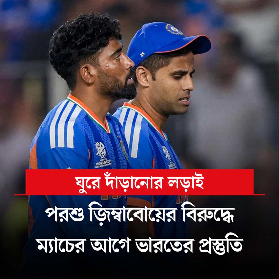 ‘আসল ম্যাচ’ আসতেই মুখ থুবড়ে পড়েছে ভারত। টি-টোয়েন্টি বিশ্বকাপের সুপার এইটে প্রথম ম্যাচেই দক্ষিণ আফ্রিকার কাছে ৭৬ রানের বিশাল ব্যবধানে হেরেছে সূর্যকুমার যাদবের দল। স্পিনাররা একেবারেই ভাল বল করতে পারেননি। ডুবিয়েছেন ব্যাটারেরাও। দল নির্বাচন নিয়েও প্রশ্নের মুখে কোচ গৌতম গম্ভীর। পরশু ভারতের সামনে জ়িম্বাবোয়ে। এই ম্যাচের আগে কী ভাবে প্রস্তুতি নিচ্ছে ভারত? থাকছে সব খবর।
