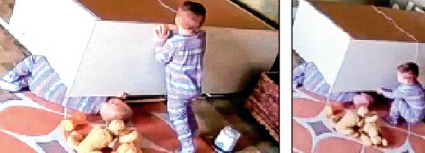 ঘরের কোণে একটা মাঝারি আলমারি। আর তা বেয়ে ওঠার চেষ্টায় ব্যস্ত বছর দুয়েকের যমজ ছেলে। মুহূর্তেই উল্টে গেল আলমারি। আর তার তলায় চাপা পড়ে গেল দুই খুদে!
