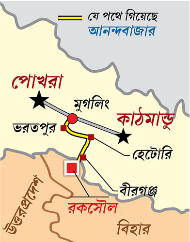 বাস্তবিক কাঠমান্ডু যাওয়ার সহজতম রাস্তাটা এখন কার্যত অগম্য হয়ে পড়ায় যত চাপ এই পথটুকুর ওপরেই আছড়ে পড়েছে। সকালে হাওড়া থেকে রকসৌল স্টেশনে নামার পরই দেখা হয়েছিল কাঠমান্ডু ফেরত সুশান্ত চক্রবর্তীর সঙ্গে। কাঁকুড়গাছির বাসিন্দা বলেছিলেন, বউ-মেয়েদের নিয়ে কী ভাবে একটা ছোট বাসে কাঠমান্ডু থেকে বীরগঞ্জ হয়ে রকসৌলে ফিরেছেন। ‘‘ভাঙাচোরা রাস্তা, তায় বৃষ্টি! বারবারই ভয়ে চোখ বুজে ফেলছিলাম। কী ভাবে যে পৌঁছলাম, আমরাই জানি।’’