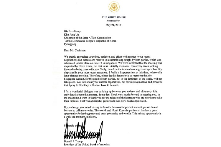 কিমকে এক চিঠিতে ট্রাম্প লিখেছেন, ‘‘১২ জুন সিঙ্গাপুরে বৈঠক আয়োজন করতে আপনি যে সময় এবং শ্রম ব্যয় করেছেন, তার জন্য আপনাকেধন্যবাদ। আমরাও এই বৈঠকে অংশ নিতে অত্যন্ত আগ্রহী ছিলাম। কিন্তু আপনাদের সাম্প্রতিক বিবৃতিতে ভয়ঙ্কর উষ্মা এবং যুদ্ধং দেহি মনোভাব প্রকাশ পেয়েছে। তাই খুব দুঃখের সঙ্গে এই সিদ্ধান্ত নিতে বাধ্য হচ্ছি।’’