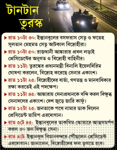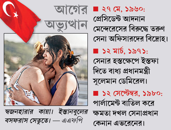 রাত তখন মোটে সাড়ে দশটা। হঠাৎই রাজধানী আঙ্কারা-সহ দেশের বিভিন্ন শহরের একাধিক গুরুত্বপূর্ণ সেতু, সরকারি ভবনে ঢুকে পড়ল উর্দি পরা সেনা। তাদের বাধা দিতে হাতে অস্ত্র তুলে নিল আরও এক দল সেনা, সঙ্গে পুলিশ। চলল গুলি-পাল্টা গুলি। তার মধ্যেই দেশের সরকারি সংবাদমাধ্যমে প্রধানমন্ত্রী বিনালি ইলদিরিম জানিয়ে দিলেন, বিদ্রোহ করেছে সেনার একাংশ। বিদ্রোহী সেনারাও পাল্টা বিবৃতিতে জানিয়ে দিল, দেশে গণতন্ত্র ও মানবাধিকার রক্ষা করতেই তাদের এই পদক্ষেপ। এক সময়ে ইস্তানবুলের আতাতুর্ক বিমানবন্দরও চলে গিয়েছিল বিদ্রোহীদের হাতে। যদিও সেনাবাহিনীর বড় অংশ এবং জনতার সক্রিয় বিরোধিতায় বিদ্রোহ স্থায়ী হল না বেশিক্ষণ। কয়েক ঘণ্টার মধ্যেই আত্মসমর্পণ করল বিদ্রোহীরা। মৃত্যুও হল অনেকের। গদিচ্যুত হওয়ার মুখ থেকে বেঁচে গেলেন প্রেসিডেন্ট রিসেপ তায়িপ এরদোগান।