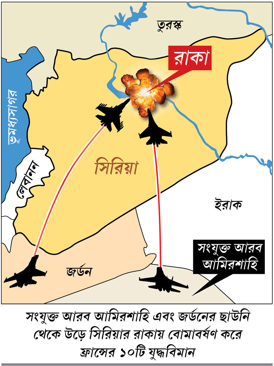রবিবার ফরাসি বিমানবাহিনীর লক্ষ্য ছিল ইসলামিক স্টেটের (আইএস) ঘোষিত রাজধানী রাকা। ফরাসি প্রশাসন একটি বিবৃতি দিয়ে জানিয়েছে, সংযুক্ত আরব আমিরশাহি এবং জর্ডনের সেনা ছাউনি থেকে উড়ে গিয়েই এই বোমাবর্ষণ করেছে তাদের বাহিনী। আমেরিকা জানিয়েছে, এই যৌথ হামলার প্রসঙ্গে শনিবার রাত থেকেই ফরাসি প্রশাসনের সঙ্গে ফোনে কথাবার্তা চলেছে মার্কিন প্রতিরক্ষা সচিব অ্যাশটন কার্টারের।