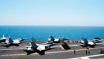 প্রস্তুতি। মার্কিন যুদ্ধজাহাজ থেকে ওড়ার অপেক্ষায় সার সার যুদ্ধবিমান।