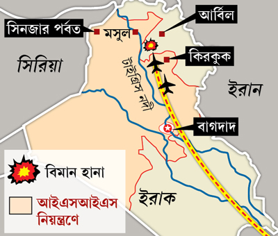 জর্জ এইচ ডব্লিউ বুশ থেকে উড়ে যায় মার্কিন এফএ-১৮ যুদ্ধবিমান। জঙ্গিদের লক্ষ করে তারা বোমা ফেলে স্থানীয় সময় সন্ধে ছ’টা কুড়ি নাগাদ। পরে গভীর রাতে আবার বোমাবর্ষণ করে মার্কিন বিমান। পেন্টাগনের যুক্তি, কৌশলগত ভাবে আর্বিল ও বাগদাদের গুরুত্ব অসীম। ফলে এ দু’টি শহর জঙ্গি দখলে যেতে দেওয়া যাবে না।