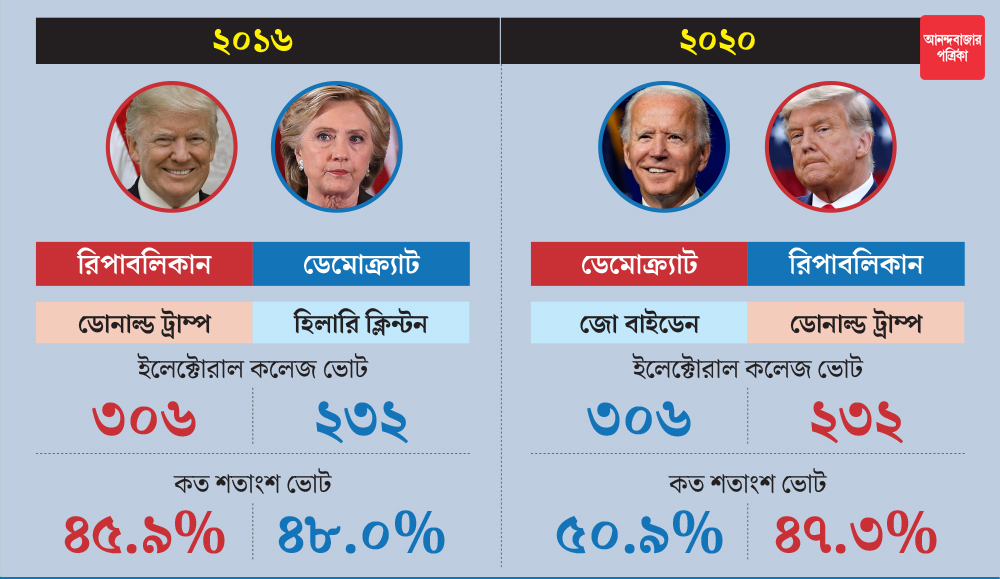 ২০১৬ সালের ভোটের ফল ছিল ঠিক উল্টো। সে বার ইলেক্টোরাল কলেজের ৩০৬টি ভোট ট্রাম্পের পক্ষে গিয়েছিল। হিলারি ক্লিন্টন পেয়েছিলেন ২৩২টি।
