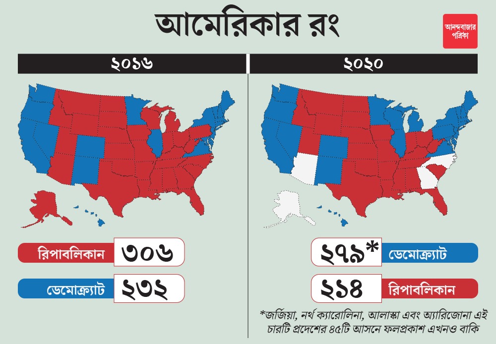 ট্রাম্প আর বাইডেন তো নিমিত্তমাত্র। শেষ করা যাক গণতন্ত্রের জয় এবং পরাজয় দিয়ে। এই পরিস্থিতিতেও মানুষ ভোট দিয়ে রেকর্ড করেছেন। এখনও পর্যন্ত পাওয়া খবরে বোঝা যাচ্ছে, মোট ভোট পড়েছে গত বারের থেকে ১ কোটির মতো বেশি, যা কিনা প্রায় ৬-৭ শতাংশ। তবে এই নির্বাচন নিয়ে যা হল, তা আমেরিকার মতো একটা দেশের পক্ষে ভাল বিজ্ঞাপন নয়। তার একটা বড় কারণ অবশ্যই ট্রাম্প এবং আগাম ভোটের তুরুপের তাসে মাত হলেন তিনি। এখন হেরে গিয়েও হার না-মানার খেলায় নেমেছেন দক্ষিণপন্থী রাষ্ট্রনায়ক। মার্কিন দেশে এখনও তিনি দু’মাসের ওপর ক্ষমতায় থাকবেন। ভোটফল বেরিয়ে গেলেও সে দেশে ক্ষমতার হাতবদল হয় পরের বছর। সুতরাং একুশের ২০ জানুয়ারি পর্যন্ত অপেক্ষা। এঁর মধ্যে ট্রাম্প সাহেব যদি পুতিন, জিনফিং, কিম, এরদোগান এঁদের সঙ্গে শীর্ষ বৈঠক সেরে ফেলেন, তা হলে জীবৎকালে প্রেসিডেন্ট থেকে যাওয়ার সফল মন্ত্র শিখতে পারবেন। আর দয়া করে কোর্টে না গিয়ে যদি গণতন্ত্রকে ক্ষমা করেন, তা হলে পরীক্ষা শুরু বাইডেনের। ২৭০-ই পান কিংবা ৩০০, জেতার পর আসনের আর দাম নেই। এত কৌশলের পরেও সেনেট সম্ভবত থেকে গেল রিপাবলিকানদের হাতেই। অন্তত সামনের দু’বছরের জন্য। ওবামা এই পরিস্থিতির সম্মুখীন হয়েছিলেন তাঁর রাজত্বের শেষ দু’বছরে। সাম্প্রতিক কালে মার্কিন দেশে বিভাজন আরও স্পষ্ট। ফলে বাইডেন আর রাতের ঘুমে জমিয়ে নাক ডাকার সুখ পাবেন বলে মনে হয় না।