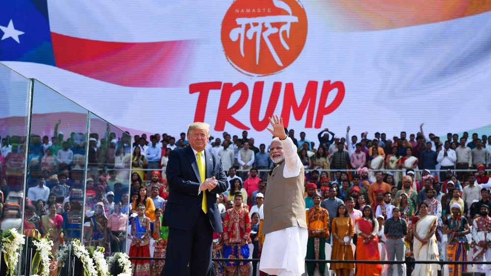 আমেদাবাদে নমস্তে ট্রাম্প অনুষ্ঠানে নরেন্দ্র মোদী ও ডোনাল্ড ট্রাম্প।