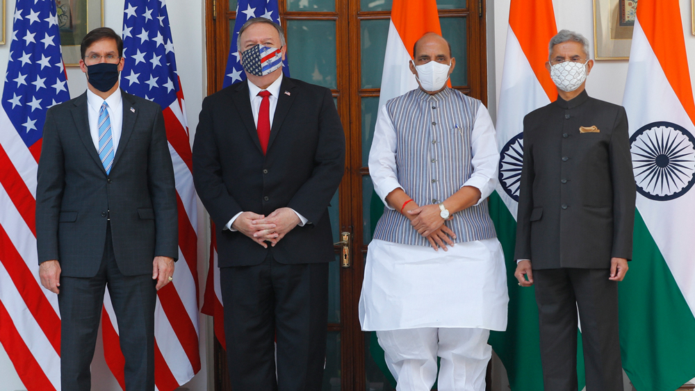 টু প্লাস টু পর্যায়ের বৈঠকে আমেরিকার প্রতিরক্ষা সচিব মার্ক টি এস্পার, বিদেশসচিব মাইকেল পম্পেয়ো, ভারতীয় প্রতিরক্ষামন্ত্রী রাজনাথ সিংহ এবং বিদেশমন্ত্রী এস জয়শঙ্কর। ছবি পিটিআই।