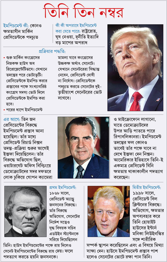 তবে তাঁর পূর্বসূরি, ৪২তম প্রেসিডেন্ট বিল ক্লিন্টনের মতো ট্রাম্পও গদি হারাবেন না বলেই মনে করা হচ্ছে। কারণ এর পরের ধাপে ইমপিচমেন্ট প্রক্রিয়া যাবে সেনেটে। হাউসের এই উচ্চকক্ষ রিপাবলিকানদের দখলে। ফলে সেখানে রিপাবলিকান প্রেসিডেন্টকে সরিয়ে দেওয়ার প্রস্তাবে দুই-তৃতীয়াংশ সেনেটর ভোট দেওয়ার সম্ভাবনা কম। বুধবার যে হাউস অব রিপ্রেজ়েন্টেটিভসে ট্রাম্পকে ইমপিচ করার প্রস্তাব গৃহীত হয়েছে, সেটি ডেমোক্র্যাটদের দখলে।