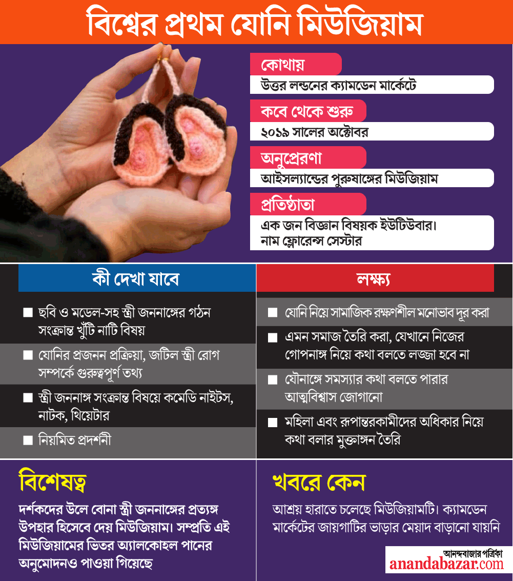 ২০১৯ সালের অক্টোবরে লন্ডনের বৈগ্রাহিক ক্যামডেন মার্কেটে খোলা হয়েছিল বিশ্বের প্রথম যোনি সংক্রান্ত মিউজিয়ামের দরজা। প্রতিষ্ঠাতা ফ্লোরেন্স সেস্টার একটি গণ অনুদানের সাহায্যে এই মিউজিয়ামের অর্থ জুগিয়েছিলেন। ফ্লোরেন্সের পরিকল্পনা ছিল, যোনি সংক্রান্ত এই মিউজিয়ামকে আগামী দিনে আরও পরিসরে বাড়াবেন। কিন্তু বাস্তবে দু’বছরের মাথায় তাঁদের ভাবতে হচ্ছে, ঘর না পেলে মিউজিয়ামের জিনিসপত্র কোথায় নিয়ে যাবেন।