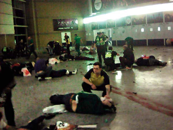 ম্যাঞ্চেচেস্টার এরিনায় আত্মঘাতী হামলার পরে ছড়িয়ে-ছিটিয়ে রয়েছে দেহ।