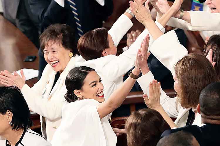 হাউস-চিত্র: ‘স্টেট অব দ্য ইউনিয়ন’ বক্তৃতা দিচ্ছেন প্রেসিডেন্ট ডোনাল্ড ট্রাম্প। তারই ফাঁকে হাসি-ঠাট্টায় মাতলেন ডেমোক্র্যাট আলেকজ়ান্দ্রিয়া ওকাসিয়ো-কোর্তেজ়দের সাদায় মোড়া প্রমীলা ব্রিগেড।