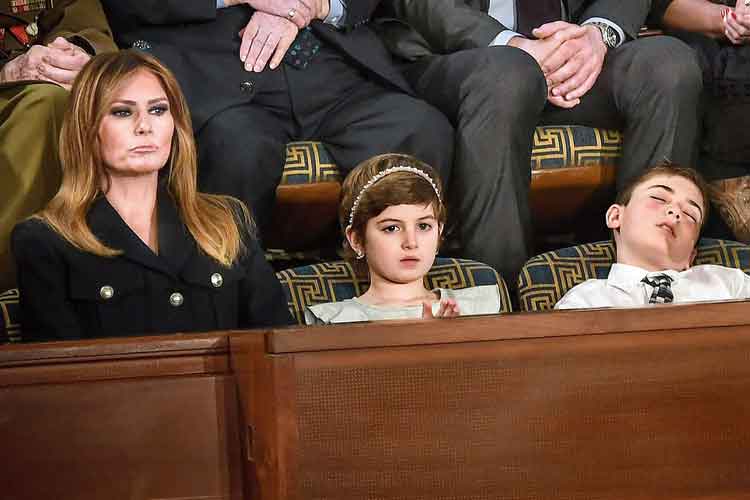 ফার্স্ট লেডি মেলানিয়া ট্রাম্প অবশ্য আগাগোড়া সব মন দিয়ে শুনলেন। মনোযোগী শ্রোতা ক্যানসার-জয়ী অতিথি, ছোট্ট গ্রেস এলিনও। হোয়াইট হাউসের আর এক অতিথি, খুদে ট্রাম্প যদিও ঘুমিয়ে কাদা। জশুয়া ট্রাম্প। প্রেসিডেন্টের সমনামী হওয়ায় সবাই যাকে স্কুলে খেপায়।