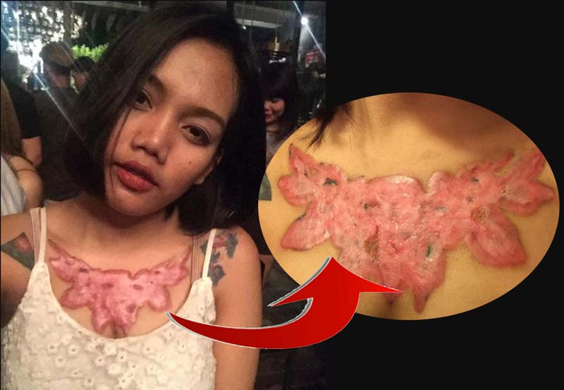 ঘটনাটি ঘটেছে তাইল্যান্ডে। জানা গিয়েছে, গত বছর শখ করে গলা ও বুকের ঠিক মাঝামাঝি ফুলের ডিজাইন করা একটি ট্যাটু করিয়েছিলেন কলেজ ছাত্রী পাসুদা রিও। তবে এটি লেজার ট্যাটু নয়। এই ট্যাটু অনেকটা স্টিকারের মতো। ইউরোপের বিভিন্ন দেশে এমন ট্যাটুও বেশ জনপ্রিয়। কিন্তু এই ট্যাটু করানোর পর থেকেই পাসুদার শরীরের ওই অংশটি চুলকাতে ও জ্বালা করতে শুরু করে। পরিস্থিতি বেগতিক দেখে ট্যাটুটি তুলে ফেলতে উদ্যোগী হন তিনি। কিন্তু ভাবতেও পারেননি এর পরিণতি কতটা মারাত্মক হতে চলেছে!