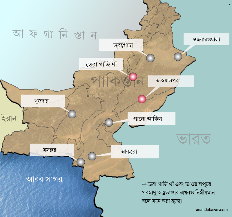 সিন্ধ প্রদেশের আকরো, পানো আকিল এবং মসরুর ঘাঁটিতে পাকিস্তান পরমাণু অস্ত্র মোতায়েন করেছে এবং তা নিক্ষেপের পরিকাঠামোও তৈরি করে ফেলেছে বলে রিপোর্টটিতে জানানো হয়েছে। এ ছাড়া বালুচিস্তানের খুজদার, পঞ্জাবের গুজরানওয়ালা এবং দেশের উত্তর-পশ্চিমাংশের সরগোঢা সামরিক ঘাঁটিতেও পরমাণু অস্ত্র এবং তার প্রয়োগ পরিকাঠামো তৈরি। ভারতীয় সীমান্ত লাগোয়া আর এক পঞ্জাবি শহর ভাওয়ালপুর এবং আফগান সীমান্তের কাছাকাছি ডেরা গাজি খাঁ-তে পাকিস্তানের যে দু’টি সামরিক ঘাঁটি রয়েছে, সেখানেও পরমাণু অস্ত্র পৌঁছে গিয়েছে বলে মার্কিন রিপোর্টটির ইঙ্গিত। তবে এই দুই সামরিক ঘাঁটিতে পরমাণু অস্ত্র নিক্ষেপের পরিকাঠামো সম্ভবত পুরোপুরি প্রস্তুত নয়। তা দ্রুত তৈরি করা হচ্ছে।