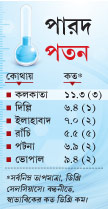 আঁচ পাচ্ছে কলকাতাও। এই সে দিন মহানগরের সর্বনিম্ন তাপমাত্রা ১৯ ডিগ্রি সেলসিয়াসের আশপাশে ঘোরাফেরা করছিল। সোমবার তা নেমে গিয়েছে ১১.৩ ডিগ্রিতে। দমদমে ৯.৬। বস্তুত পারদ আর একটু নামলেই উত্তর ২৪ পরগনার শহরঘেঁষা এলাকা শৈত্যপ্রবাহের কবলে পড়বে। মেদিনীপুর (৯.৫) ও পুরুলিয়ায় (৭.১) শৈত্যপ্রবাহ ঘোষিত হয়ে গিয়েছে। বীরভূম, বাঁকুড়া, বর্ধমান কার্যত শৈত্যপ্রবাহের দোরগোড়ায়। উপকূলবর্তী দিঘা, ডায়মন্ড হারবার, ক্যানিংয়ে সর্বনিম্ন ১০ ডিগ্রির কাছে নেমেছে। বিহার-ঝাড়খণ্ডেও জাঁকিয়ে ঠান্ডা। রাঁচির রাতের তাপমাত্রা ৫.৫ ডিগ্রি ছুঁয়ে ফেলেছে। সেখানেও বইছে শৈত্যপ্রবাহ।