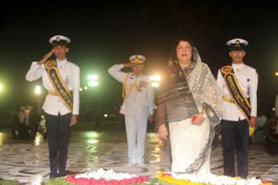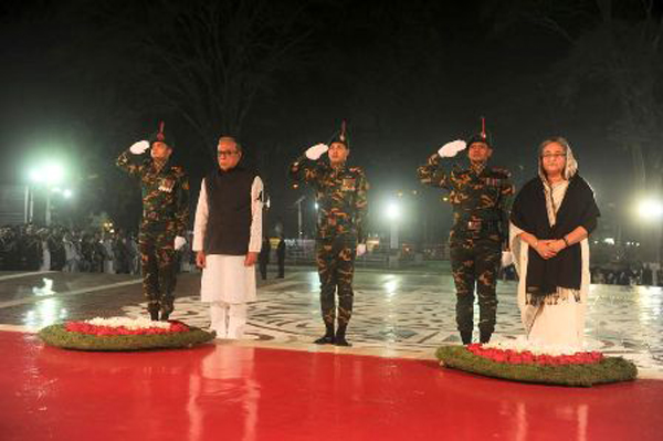ভাষাশহীদদের শ্রদ্ধা জানাচ্ছেন বাংলাদেশের রাষ্ট্রপতি আবদুল হামিদ ও প্রধানমন্ত্রী শেখ হাসিনা।