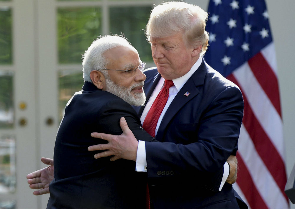 মোদীর আলিঙ্গনে হতবাক করমর্দন পটু ট্রাম্প। ফাইল চিত্র।