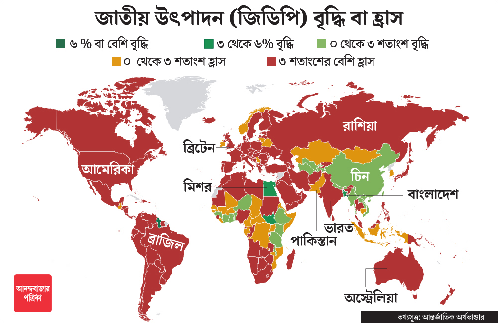 এ হেন ‘ঠেকের তত্ত্ব’ যতই কষ্টকল্পিত হোক, তথ্য হল— চিন বিশ্বের একমাত্র বড় অর্থনীতি, যে এই কোভিড বছরেও আর্থিক বৃদ্ধির মুখ দেখল। আমেরিকা থেকে ভারত, রাশিয়া থেকে অস্ট্রেলিয়া, ইংল্যান্ড, ফ্রান্স, সৌদি আরব, ব্রাজিল— সকলের জাতীয় উৎপাদন ২০২০ সালে কমে গিয়েছে। শি জিনপিং-এর হাসি আপাতত চওড়া।