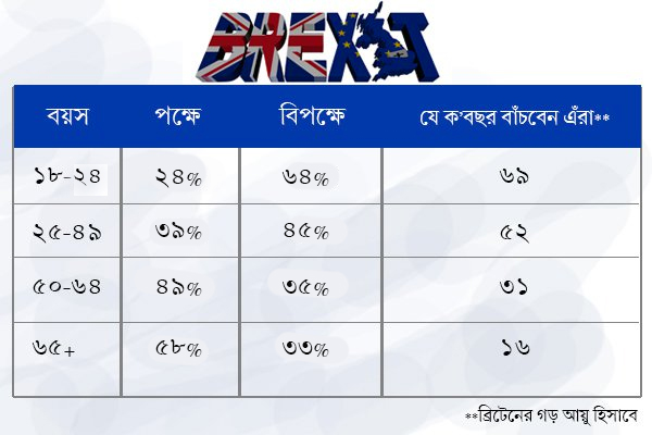 গণভোটের রায়ে ইউরোপীয় ইউনিয়ন থেকে ব্রিটেন বেরিয়ে গেল ঠিকই, কিন্তু প্রশ্ন রেখে গেল অনেক। দেখা যাচ্ছে, ৩৯ শতাংশ ব্যক্তি যাঁদের বয়স ৬০-এর উর্ধ্বে তাঁরাই ব্রেক্সিট পক্ষে রায় দিয়েছেন সবচেয়ে বেশি। তরুণ প্রজন্ম যে ইউনিয়ন থেকে ব্রিটেনের বেরিয়ে যাওয়াটা আটকাতে চেয়েছিল, ভোটের ফলাফলে সে ছবিটা পরিষ্কার। দেখা গিয়েছে, ১৮-২৪ বছর বয়সীদের সিংহ ভাগ ইউরোপীয় ইউনিয়নে ব্রিটেনের থাকার পক্ষে রায় দিয়েছে। বিশেষজ্ঞরা বলছেন, আজকে যাঁরা ব্রেক্সিট-এর পক্ষে রায় দিয়েছেন, তাঁরা আর মাত্র ১৬ বছর বাঁচবেন। কিন্তু যে তরুণ প্রজন্ম ব্রেক্সিটের বিরুদ্ধে রায় দিয়েছেন, ব্রিটেনের গড় আয়ুর হিসেব অনুযায়ী তাঁরা বাঁচবেন ৫২-৬৯ বছর। সুতরাং আজকে যাঁরা ইউরোপীয় ইউনিয়ন থেকে ব্রিটেনের বিচ্ছিন্ন হওয়ার সিদ্ধান্ত মেনে নিতে পারেননি, আগামী ৩০ বছর পর তাঁরাই আবার বলবেন না তো আরও এক বার গণভোট নেওয়া হোক!